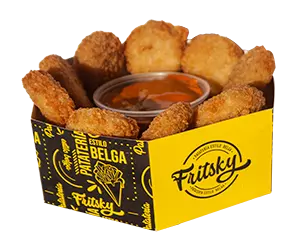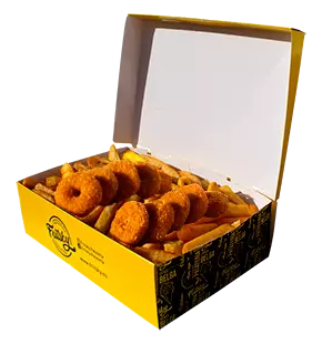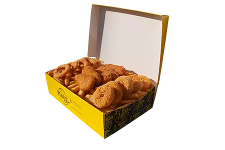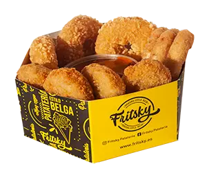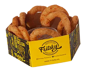 Patatas crujientes con snacks de pollo, queso y aros de cebolla